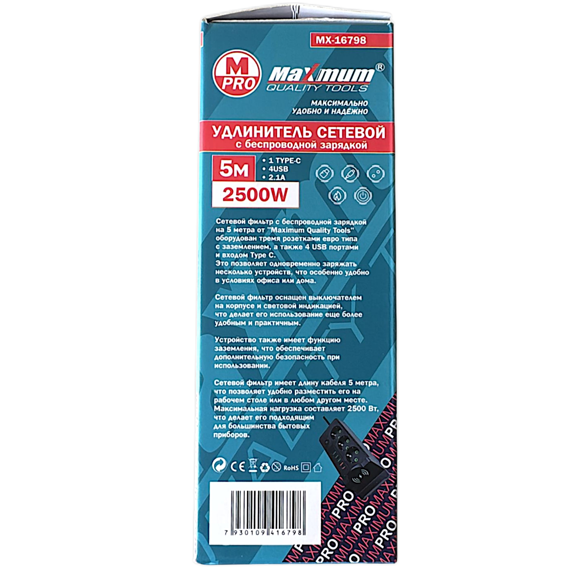 Фильтр сетевой 5 метров с беспроводной зарядкой от "Maximum Quality Tools" - это отличный выбор для тех, кто хочет обеспечить безопасную работу своих электронных устройств. Черный сетевой фильтр оборудован современной беспроводной зарядкой, 3-мя Евро розетками, 4-мя USB портами и 1-м разъемом Type-C, что позволяет быстро и легко заряжать свои устройства без необходимости использовать провода. Удлинитель имеет входное напряжение 220 В и номинальный ток 16 А.